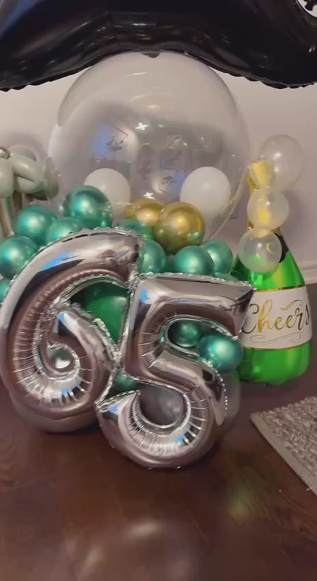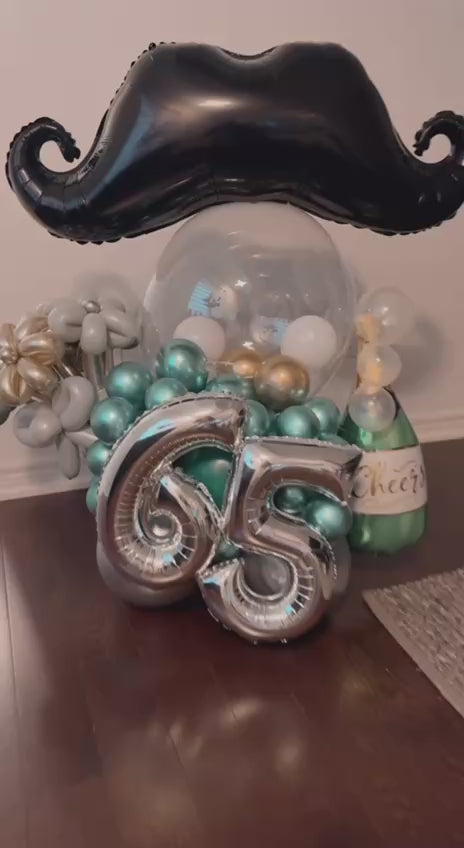 Celebrate a milestone in style with this playful 65th birthday balloon arrangement! Featuring large silver “65” balloons, metallic green and gold accents, a bubbly champagne bottle balloon, and a comical oversized mustache topper—this arrangement brings joy, humor, and class to any driveway surprise or party backdrop. Perfect for dads, uncles, or anyone turning 65 with flair!