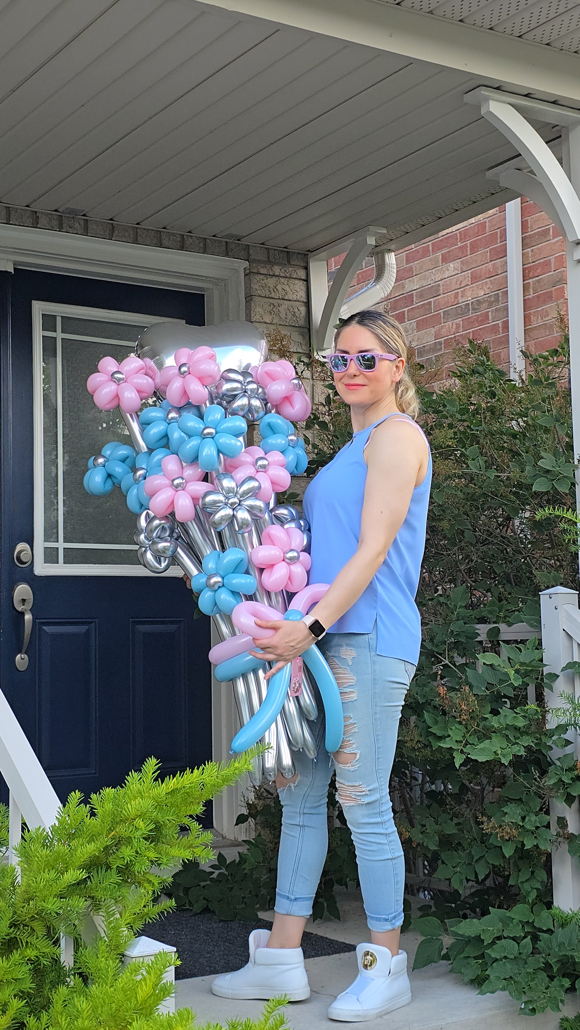 Add a touch of magic to your gender reveal celebration with our “He or She?” Balloon Flower Bouquet — a charming mix of pastel pink and baby blue balloon flowers accented with shiny silver petals and a heart-shaped topper. Whether you're announcing your baby’s gender or decorating for the big reveal, this handcrafted bouquet brings elegance, excitement, and joy to your special day.