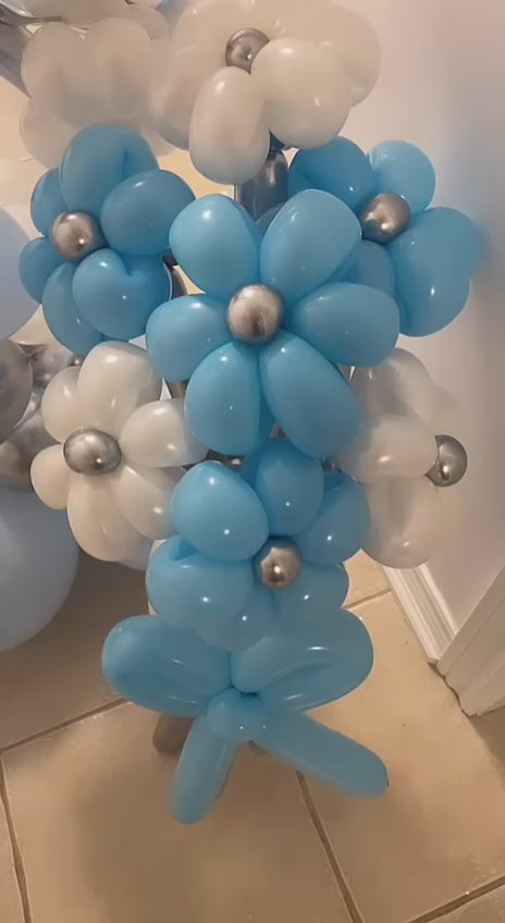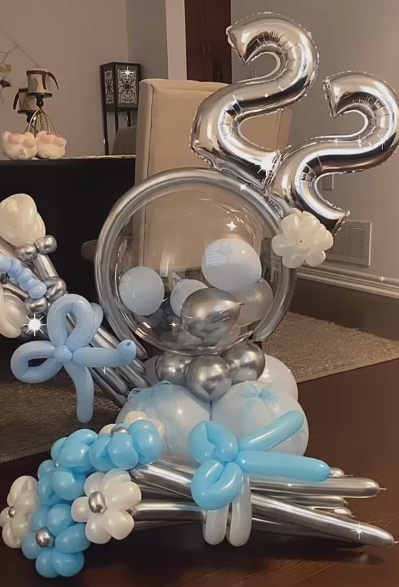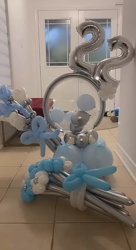 This stunning balloon arrangement features a sophisticated blend of silver and soft blue tones, perfect for a 22nd birthday celebration. With shiny silver number balloons, intricate balloon flowers, and delicate bow designs, this piece adds a touch of elegance to any party setting. The large central balloon ring is accentuated by clusters of metallic and pastel balloons, creating a luxurious and festive atmosphere. Ideal for making a statement at entryways or as a photo backdrop for your special day. Customizable for any age or event!