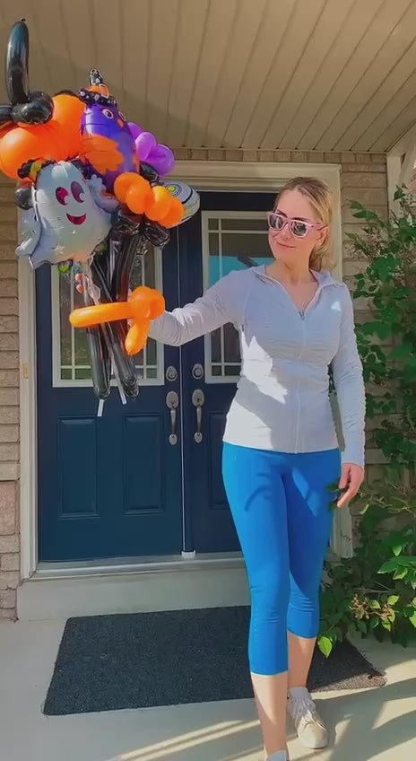Bring extra fun to your Halloween festivities with this adorable and colorful balloon bouquet! Featuring playful designs like a friendly ghost, an adorable pumpkin, and a mischievous witch, this arrangement is perfect for kids' parties or as a festive gift. The bright orange, purple, and black balloons capture the Halloween spirit while keeping it lighthearted and fun. Fully customizable, this cute balloon bouquet is guaranteed to bring smiles and excitement to any Halloween event!