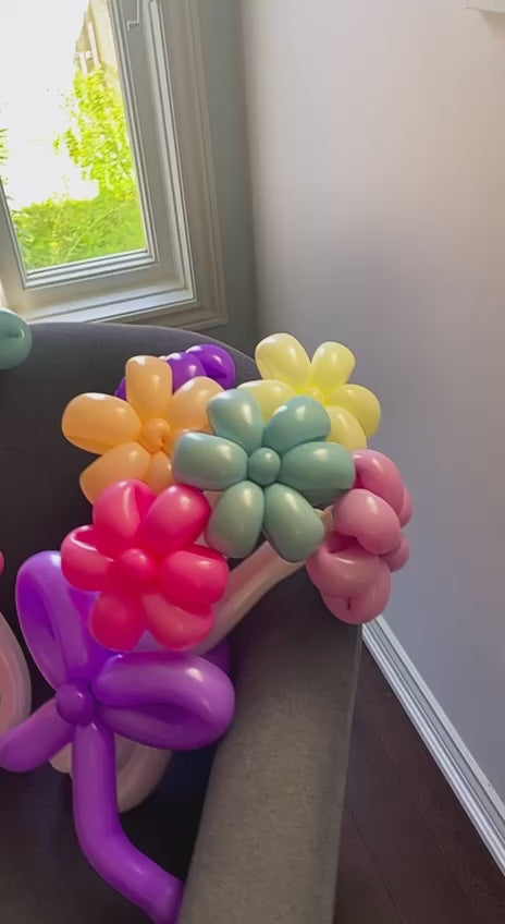 Brighten up any space with these cheerful double balloon flower bouquets! Each bouquet features a vibrant mix of pastel and bold flowers, tied together with playful bows in pink and purple. Perfect for birthdays, baby showers, or as a whimsical decorative piece, these colorful bouquets bring joy and fun to any occasion. A lovely and unique alternative to traditional floral arrangements!