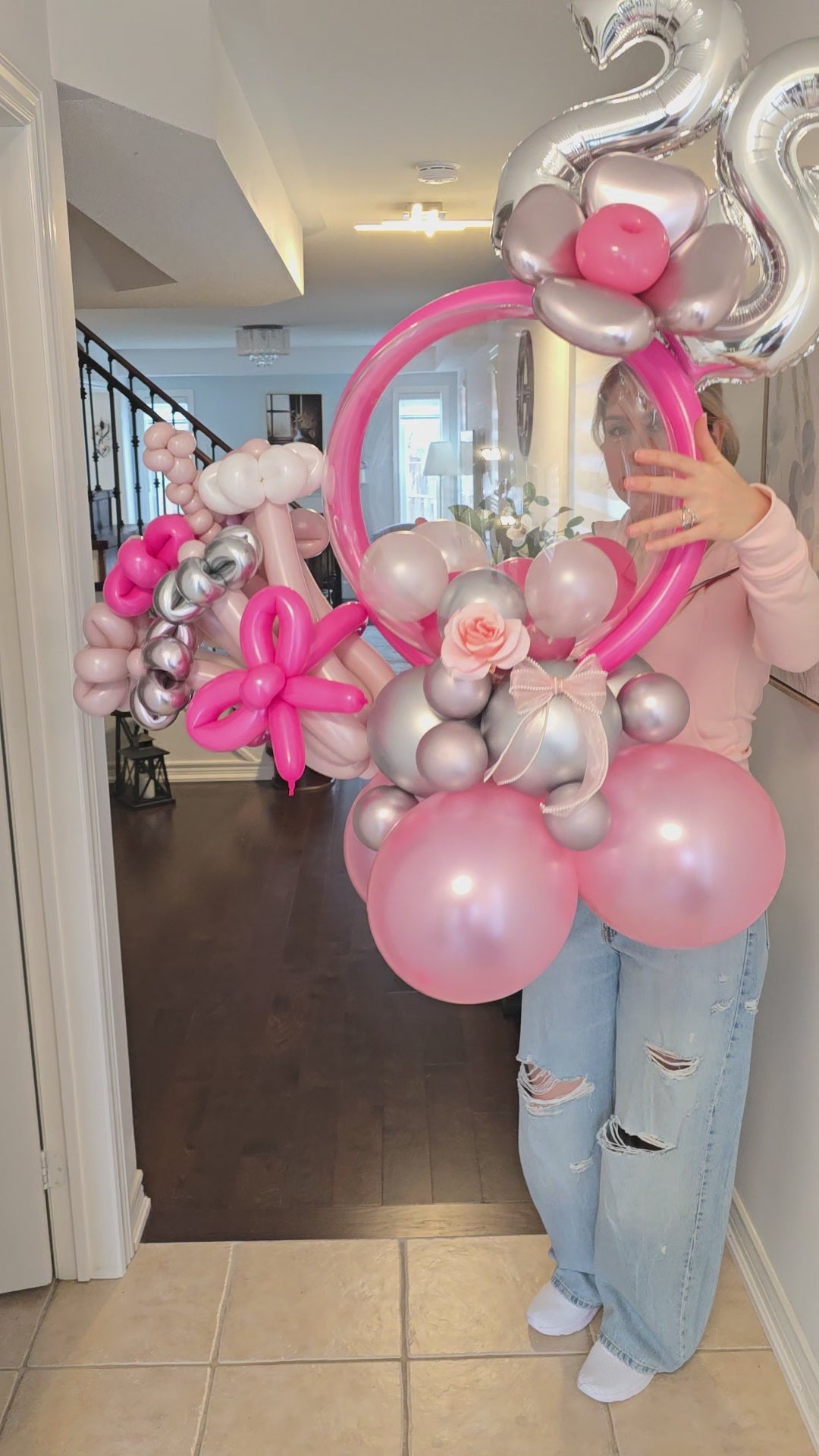 Celebrate in style with our custom-designed birthday balloon arrangement! This eye-catching bouquet features a chic blend of metallic silver, soft blush pink, and pearlescent balloons, complete with a clear centerpiece globe and elegant flower details. Perfect for photo ops, gifts, or surprise deliveries, this arrangement adds a touch of luxury and joy to any celebration. Handcrafted with love and precision by Balloon Brilliance in Toronto.