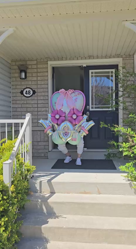 Celebrate Mom in style with this stunning Mother's Day balloon arrangement! Featuring a large pastel heart adorned with delicate floral prints, satin ribbon, and metallic "MOM" lettering, this piece is accented with charming pink flowers and soft greenery. Perfect for door-front surprise deliveries, photo moments, or as a heartfelt gift she'll never forget.