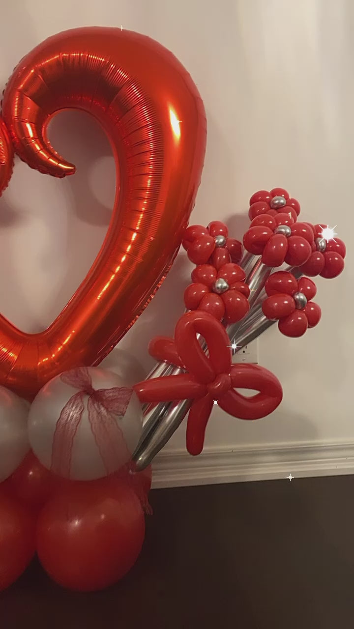 Celebrate a momentous 70th birthday with this eye-catching red and silver balloon arrangement! Featuring a bold silver '70' balloon paired with intertwined red hearts, this display radiates love and joy. The arrangement is adorned with red and silver balloon flowers, bows, and delicate lace accents, making it a perfect choice for a romantic and festive celebration. Whether for a birthday, anniversary, or a special event, this display adds a touch of elegance and charm to any occasion.