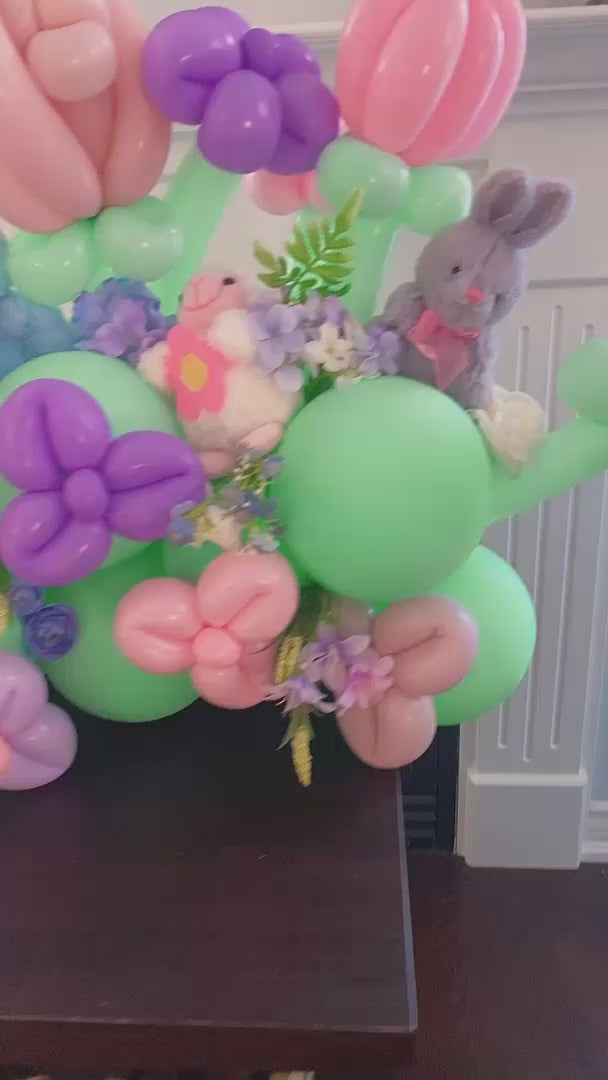 Bring the charm of a blooming garden indoors with this whimsical balloon flower arrangement. Featuring soft pastel tulip-shaped balloons and butterfly details in shades of pink, purple, and green, this design is perfect for any spring or garden-themed event. Adorned with delicate faux flowers and plush bunny accents, this delightful display creates a cheerful and fun atmosphere, ideal for birthdays, baby showers, or special celebrations.