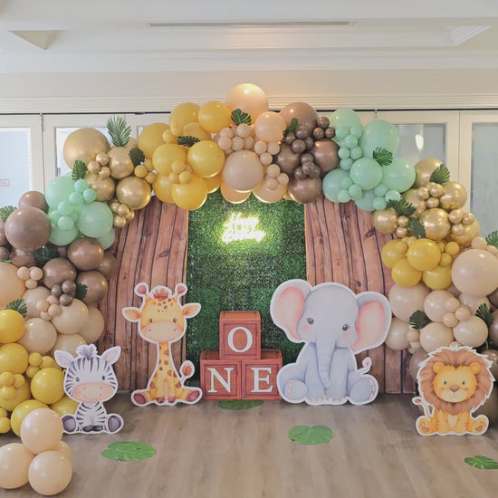 Transform your celebration into a wild adventure with our Jungle Safari Balloon Garland! Designed with a lush mix of golden, green, tan, and brown balloons, this vibrant garland brings the jungle to life with adorable safari animal cutouts including a giraffe, zebra, elephant, and lion. Perfect for a 1st birthday or any jungle-themed party, this setup includes playful balloon clusters, tropical greenery accents, wooden block props spelling βONE,β and a glowing birthday sign to complete the look. Ideal for indoor events, this garland backdrop adds a fun, photo-worthy centerpiece that guests will love.