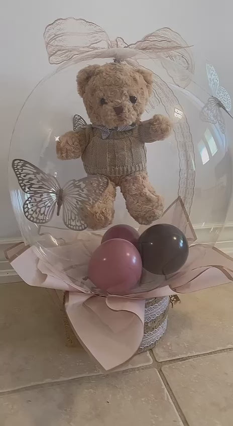 Bring joy with this adorable teddy bear balloon arrangement, perfect for gifting! This unique design features a cuddly teddy bear encased in a clear balloon adorned with delicate butterfly accents. Softly decorated with elegant lace and filled with complementary balloons, this display is ideal for baby showers, birthdays, or as a thoughtful surprise for a loved one. A sweet and heartwarming gift that adds a special touch to any occasion!