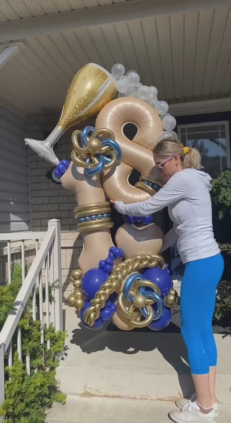 Raise a toast to 18 with this lavish navy and gold-themed balloon arrangement! Featuring an elegant champagne bottle pouring bubbly, this grand design is perfect for celebrating a milestone in style. The beautiful floral accents and intertwined metallic details add a touch of luxury, making it an eye-catching centerpiece for any birthday celebration. Fully customizable, this design is perfect for making the guest of honor feel special on their big day. Perfect for indoor or outdoor events, this setup brings a classy, celebratory vibe to the occasion!