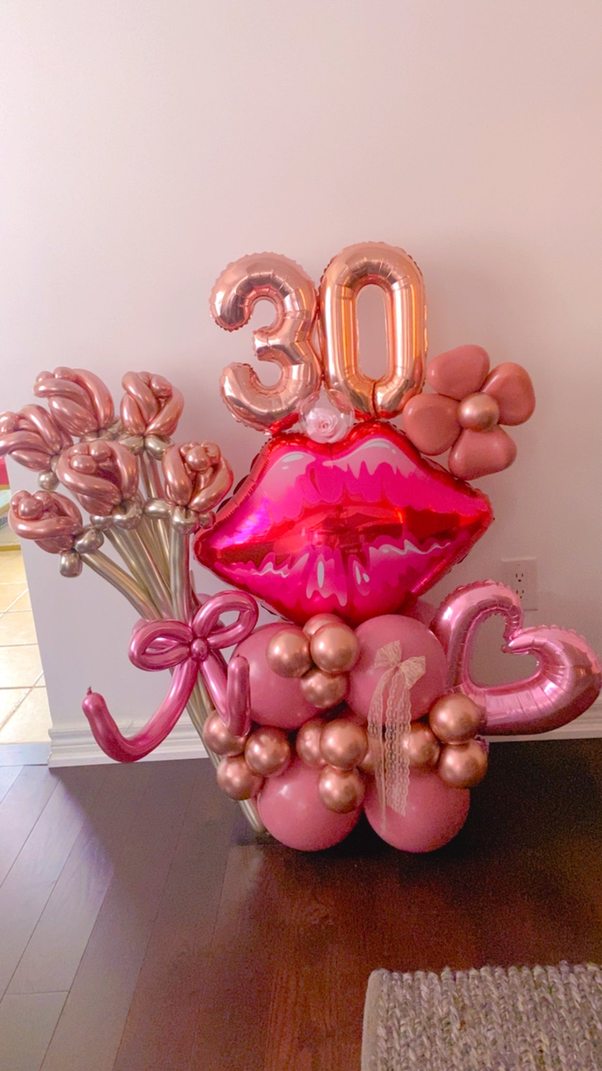 Celebrate a fabulous 30th birthday with this stunning rose gold balloon arrangement! Featuring a metallic '30' balloon, oversized pink lips, and beautiful floral accents, this design is perfect for adding a touch of glamour to the big day. Complete with a bouquet of rose gold balloon flowers and heart-shaped accents, this eye-catching display is ideal for anyone looking to make their milestone birthday sparkle. A chic and stylish way to mark the start of a new decade!