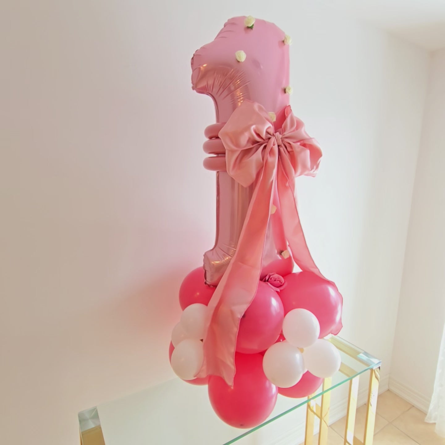 Make your celebration unforgettable with this luxurious pink number balloon centerpiece, designed for baby showers, birthdays, milestone birthdays, and special events. Featuring a 40-inch metallic foil balloon, delicate hand-placed floral accents, a satin bow, and a stunning balloon base, this arrangement adds a sophisticated touch to any occasion.