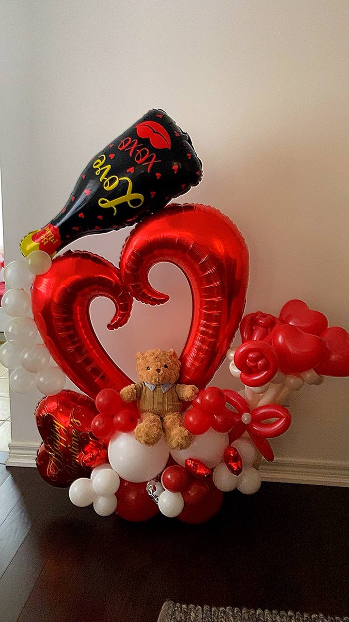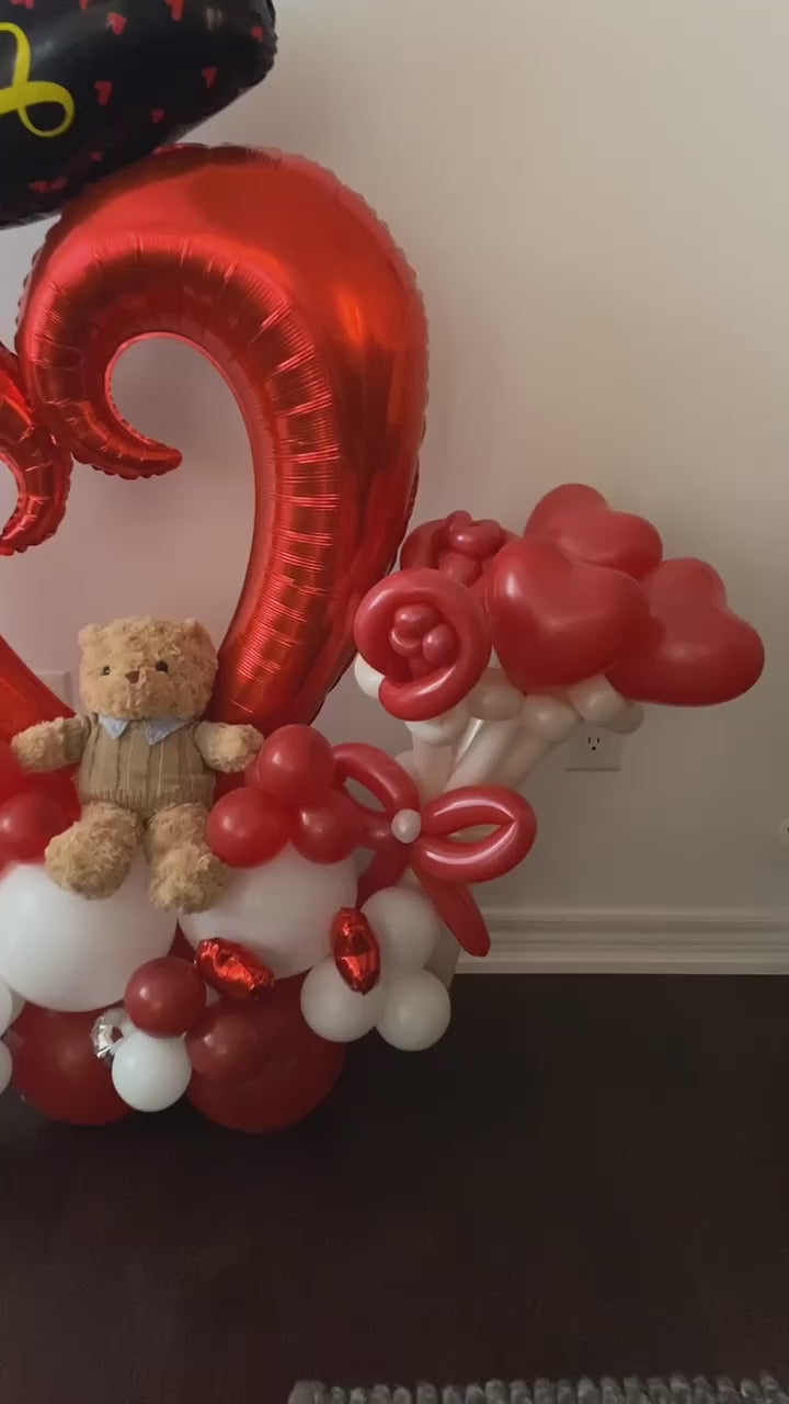 Show your love with this eye-catching balloon arrangement, perfect for Valentine's Day, anniversaries, or any romantic occasion. Featuring a radiant red double-heart centerpiece, a mini bouquet of red roses, and a whimsical bottle balloon with “Love You” script, this arrangement sets a playful yet heartfelt tone. The adorable plush teddy bear adds a touch of warmth, making this display perfect for creating unforgettable moments. Crafted with high-quality balloons in vibrant red, white, and metallic accents, this design is sure to bring joy and make a lasting impression.