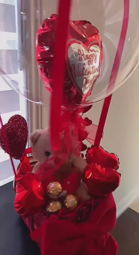 Surprise your loved one with this stunning Valentine’s Day balloon arrangement! Featuring a clear bobo balloon with a floating heart balloon inside, a cuddly teddy bear, Ferrero Rocher chocolates, and elegant red balloon roses, this gift is the perfect way to express your love.