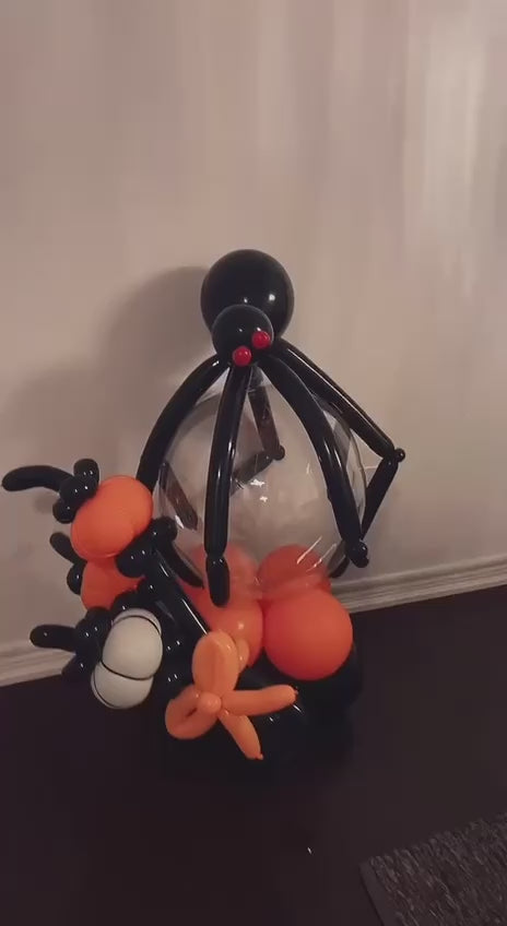 Get ready for a frightfully fun Halloween with this spooky spider balloon arrangement! This design features a giant black spider with eerie red eyes and an orange and black color palette, perfect for adding a festive and creepy touch to your Halloween event. With intricate balloon details like web-like arms and festive pumpkin accents, this piece is a great addition to your haunted house or Halloween party decor. Fully customizable, this unique display will have everyone ready to celebrate in spooky style!