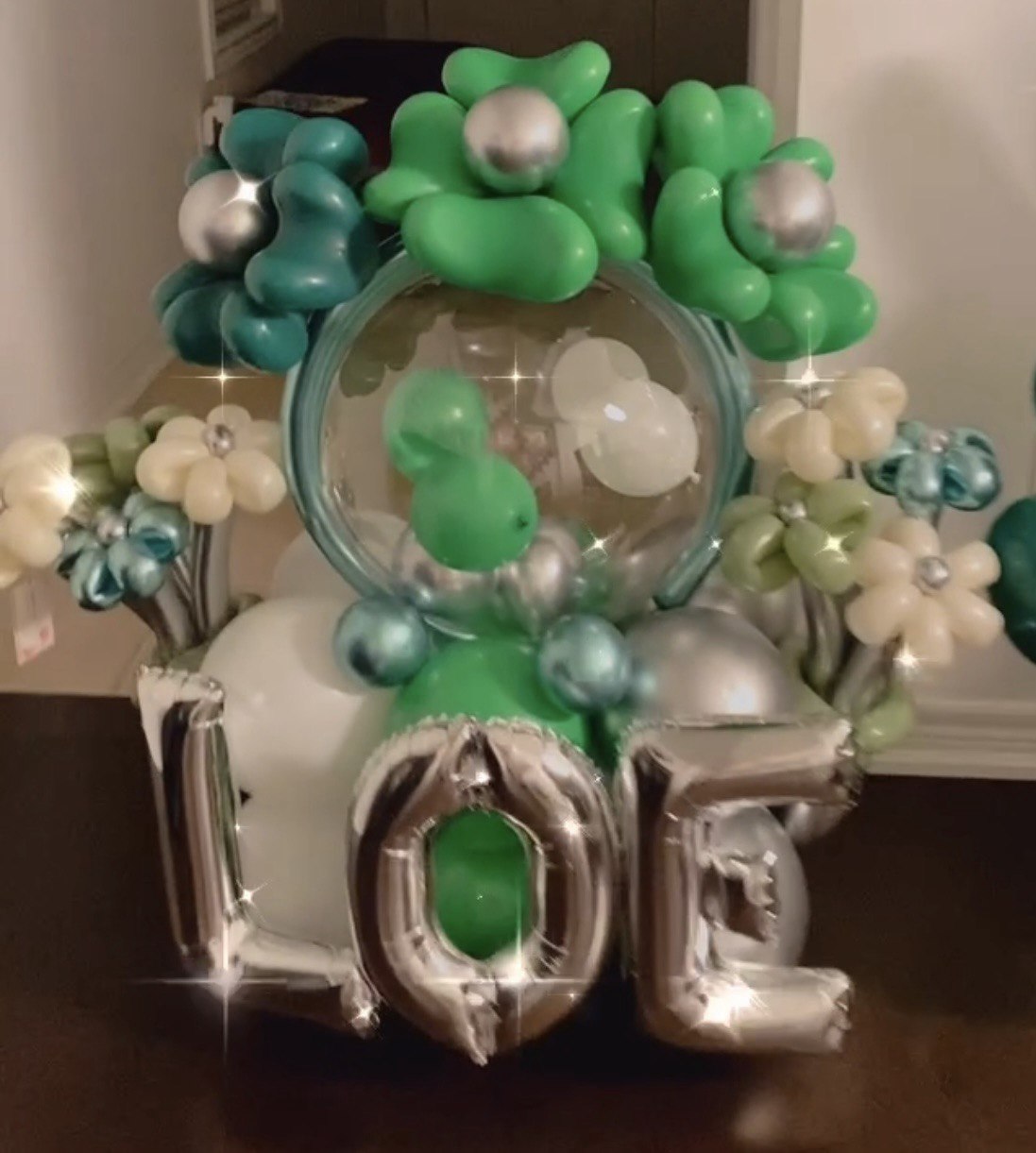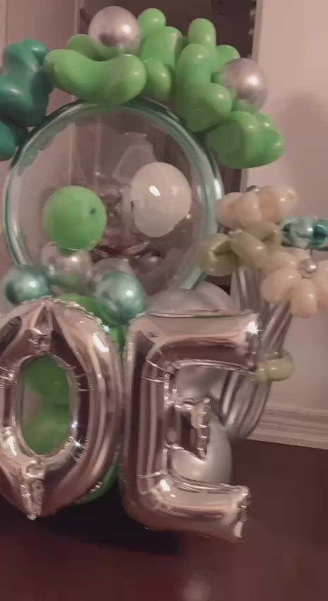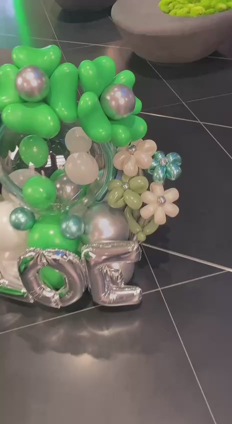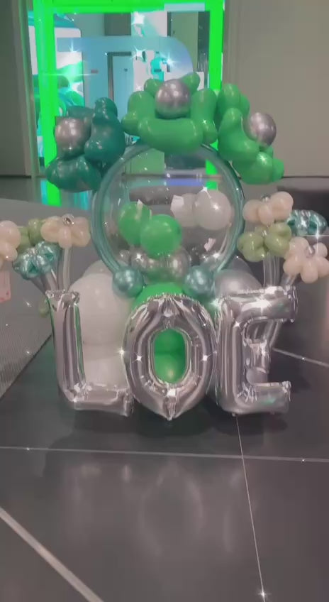 Celebrate achievements in style with this elegant TD Bank-themed balloon centerpiece, crafted for the League of Excellence annual awards. This arrangement features vibrant green and white balloon flowers, accented with metallic silver details for a refined and professional look. The centerpiece showcases a crystal-clear orb balloon surrounded by lush floral designs and topped with the bold "LOE" metallic letters, symbolizing pride and accomplishment. Perfect for award ceremonies, corporate events, and celebrations, this unique design highlights your commitment to excellence and success.